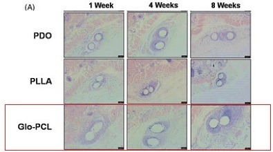 根據《美容皮膚病學雜誌》發表一篇研究,對比小老鼠的實驗記錄(所有線材長度均為50毫米,直徑0.3毫米)實驗指出,所有線材植入後都會誘發發炎反應,顯著誘導膠原蛋白生成,但與PDO和PLLA線材相比,PCL在八週時新膠原蛋白生成顯著增加50%,能夠促進更多膠原蛋白的生成和組織反應。