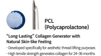 PCL線為新世代埋線線材,原應用於心血管支架與吸收縫線,並取得CE與TFDA醫療器材認證。主成分為聚己內酯,具生物相容性,結構為360°全倒鉤或錐形齒線,提拉力與錨固穩定性更優於前兩者,且柔韌性高、不易斷裂,更適合高張力部位,加上降解速度慢,能長期維持組織支撐並持續刺激膠原蛋白。