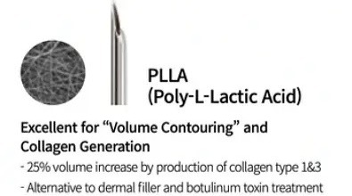 PLLA線源自醫學用童妍針Sculptra的相同材質-聚左旋乳酸,並通過FDA、CE及韓國KFDA認證,能於體內逐步分解為乳酸,刺激更多膠原蛋白,拉提收緊,同時豐盈肌膚的飽滿度。缺點是,硬度高,異物感較明顯,為了加強錨固力,線體多採錐型設計,能穩定抓住SMAS層,抵抗組織應力並維持張力穩定。